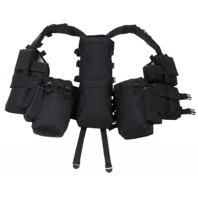 Grundmaterial Netzgewebe größenverstellbar durch seitliche Zugbänder 2 Innentaschen mit RV,6 Magazintaschen davon 2 abnehmbar per Klett,5 Außentaschen mit Klett ,davon 3 abnehmbar,Patronenhalter für5 Patronen abnehmbar per Klett,2 Molletaschen mit Clip abnehmbar,1 abnehmbares Pistolenholster mit Magazintasche. 1 Koppel mit Plastikverschluss.